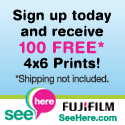 Did you know you can get 100 FREE PRINTS from SeeHere.com by FujiFilm when you sign-up for a new account? Just use the coupon code prints. When I signed-up for a new account last January, shipping was a reasonable $3.19 to my house (but I only got 50 free prints). I knew this would be a great offer for some of my readers who scrapbook or just have a lot of prints they’d like to order for a reasonable price. And this offer is available until December 31, 2009.