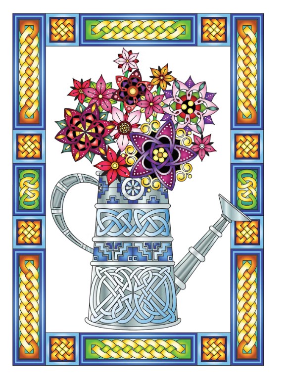 Get your markers or colored pencils for these free Celtic Gardens adult coloring pages from Dover. There are six pages you can print, just click on the numbers at the top right to scroll through them. Right-click on the image and “Save image as” to your desktop so you can print them. Celtic-themed coloring pages include: rooster and chickens outside of a garden, mandala with butterflies, Hello Sunshine sign, cornucopia, flowers inside of a watering can, A Garden of Kisses sign with potted plants.