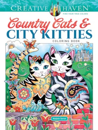 Get your markers or colored pencils for these free Country Cats & City Kitties adult coloring pages from Dover. There are three pages you can print, just click on the numbers at the top right to scroll through them. Right-click on the image and “Save image as” to your desktop so you can print them. Cat-themed coloring pages include: cats in a garden by birdhouses, a cat by a cat clock and cats playing music.